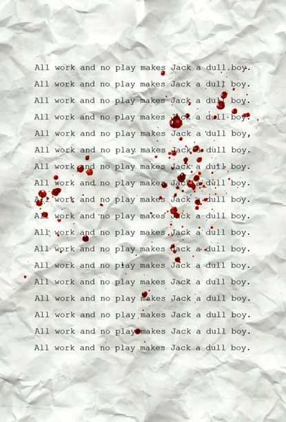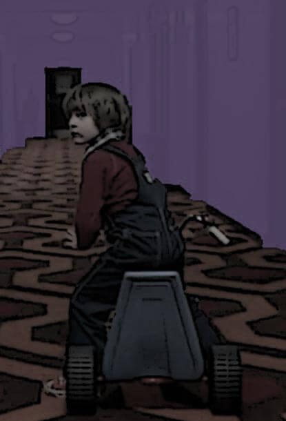 Room 237 – in the book this is a scandal at the hotel where a 60 year old lawyer named Mrs Massey has a fling with a toyboy. He jilts her and debunks with her car. She cuts her wrist and commits suicide in the bath. Her angry rotting corpse haunts the hotel. Danny is enticed into room 237 by the twins, who throw him a yellow ball. They want him to join them on the other side so they can “play for ever and ever”. To Jack she presents as an attractive young woman who morphs into the rotting corpse that she is – he flees in fear and disgust, but denies the encounter because unlike Wendy, he doesn’t want to leave the hotel. According to Shelley Duvall and Vincent Lombruto Kubrick changed the identity from Mrs Massey to Mrs Grady. This would explain the changing expressions of Jack from fear to recognition to lust.